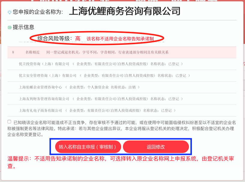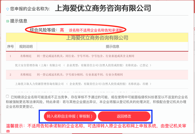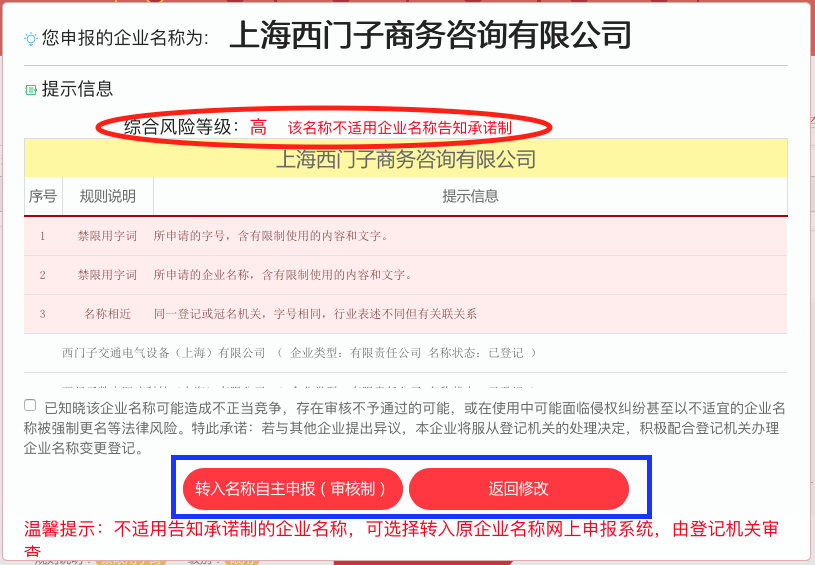 原因在于,并不是所有的拟用名称都能适用“告知承诺制”,说得更确切一些是只有系统判断为中级风险或以下的名称才能以“告知承诺制”申报。系统如果判定是高级风险,则只能改用老方式申报,即仍然进行人工审核。下面举例说明(除了列举的原因,下列名称可能存在多种高风险因素):