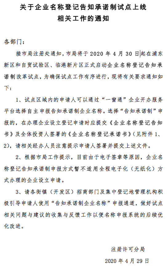 根据上海市市场监管局(以下简称“市局”)的最新通知,自2020年4月30日起在浦东新区和自贸试验区、临港新片区正式启动企业名称登记告知承诺制改革试点。