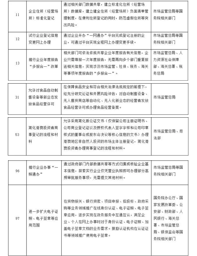 首批营商环境创新试点改革事项涉及10个方面,共计101项改革举措。其中和商事登记便利化有关的措施有十余条,包括便利企业银行开户的信息推送、企业住所标准化登记、企业变更网上办理、简化港澳投资者公证文书等。优立将相关内容摘录如下供大家参考: